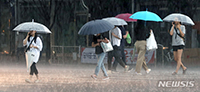 ゲリラ豪雨が降った19日午後、ソウル市内の街角にて、雨傘を差して横断歩道を渡る市民の様子。