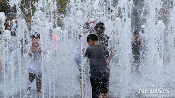 猛暑注意報が発令された20日午後、ソウル市鍾路区の光化門広場噴水台で、涼やかに噴き出す水を浴びて暑さを紛らわせる子どもたち。