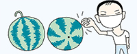 「ツル」がねじれ、下のおへそが小さなスイカの方が甘い。熟したスイカはたたいた時、澄んだ「トントントン」という音がする。