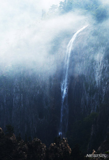 18日午前、雪岳山国立公園(江原道)権金城展望台に近い山すそで、雲の合間から姿を現した「土王城瀑布」から涼し気に水が流れ落ちている様子。