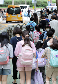 新型コロナの一日の新規患者数が126日ぶりの最多記録となる18万803人に達した17日午後、ソウル市内のある小学校で、授業を終えた児童と保護者らが下校している様子。新型コロナの再拡大に伴い、新学期を迎..