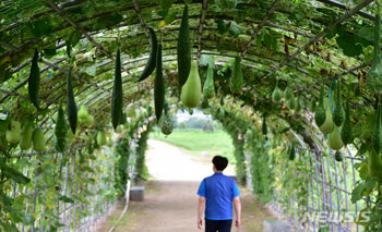 4日午前、大邱市北区を流れる琴湖江の中州の「ひょうたんトンネル」では、鑑賞用のひょうたんやへちまなど、さまざまな蔓植物の実が熟してきていた。