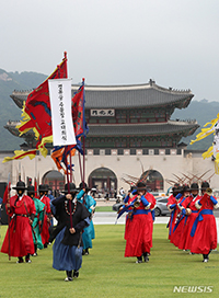 【NEWSIS】6日午前、ソウル市鍾路区の光化門広場で、守門将巡邏(じゅんら)儀式が行われた。巡邏とは、朝鮮時代に泥棒や火災の発生などを防ぐため、夜中に宮中や都城の周りを巡回したパトロール制度だ。巡..