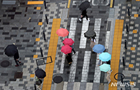 雨天となった2日午後、ソウル市中区の世宗大路で、傘を差して行き交う市民。
