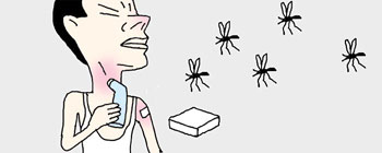 蚊に刺されてかゆみがひどい時は、指された所に液体の肩こり薬を塗り、ガーゼ付きばんそうこうを密着させて貼ると、空気が遮断されてかゆみが感じにくくなる。