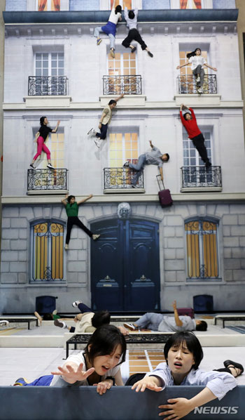 ソウル市竜山区の人工島ノドゥルソムの複合文化空間で27日午前、レアンドロ・エルリッヒの代表作「住宅」(Batiment)を体験してみる観客の様子。フランス語で建物を意味する「Batiment」は、実際..