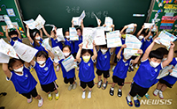 大邱市中区の慶北大学校師範大学付属小学校で15日午前、1年生の児童らが、終業式で先生から渡された通信文を手にポーズを取っている。この通信文には休み中の活動が書かれている。