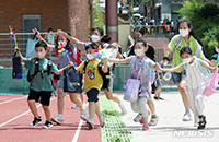 ソウル市中区の青丘小学校で15日午後、夏休みを迎えた児童が明るい表情で下校している様子。
