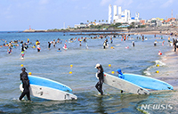 梅雨が小康状態を迎えて暑い天気となった16日午後、済州市三陽2洞の三陽海水浴場では、訪れた避暑客が水遊びをして暑さを紛らわせていた。