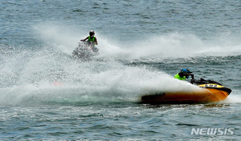【NEWSIS】17日午後、慶尚北道浦項市内の迎日台海水浴場で行われた「2022浦項市長旗全国水上オートバイ・チャンピオンシップ大会」で、波をかき分け全力疾走する選手たち。