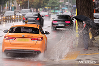 【NEWSIS】雨が降った13日午前、ソウル市鍾路区の地下鉄安国駅交差点で。横断歩道の前に大きな水たまりができて、車が通るたびに水が跳ねていた。