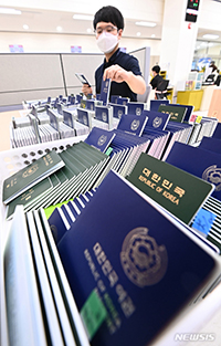 京畿道水原市の旅券民願室で7日、発給された旅券の整理に忙しい職員の様子。日常回復の後、本格的な夏休みシーズンを前に海外旅行の需要増加に伴う旅券発給業務が増えたことで、各自治体では夜間受付を行っている。