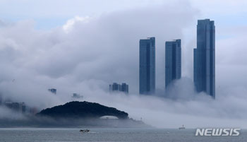 釜山地域に六日間にわたり猛暑注意報が発令される中、釜山市南区のトンセンマルから眺めた海雲台区一帯は7日、濃い海務に覆われていた。