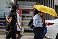 【NEWSIS】8日午前、ソウル市江南区のコンベンションセンター・COEX(コエックス)近くで、強風を伴う雨の中を出勤する人々。