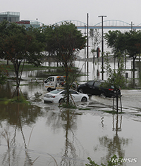 韓国首都圏・中部の広い範囲に豪雨警報が発令された30日、八堂ダムの放流量増加によって水位が上がったのに伴い、ソウル・盤浦の漢江公園からけん引されていく浸水車両の様子。
