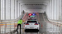 30日午前、ソウル市内を流れる漢江にかかる潜水橋は集中豪雨により通行が規制された。