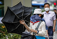 ソウルをはじめ韓国首都圏などに強風注意報が発令された28日午前、ソウル市中区の清渓広場付近で、強い風の中を行き交う市民の様子。