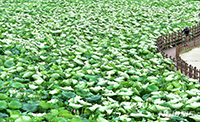 「ハスの花の中、散策路に沿って」