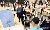【NEWSIS】金浦-羽田間の航空路線の運航が再開された29日午前、ソウル市江西区にある金浦国際空港国際線搭乗ゲートで、搭乗手続きをする乗客たち。