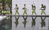 6.25戦争72周年をあすに控えた24日午前、京畿道烏山市の竹美嶺平和公園では、現場学習にやって来た子どもたちが国連軍の「スミス支隊の行軍の様子を表現した造形物の前を歩いている様子。
