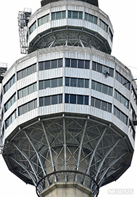 24日午前、大邱市達西区の83タワーでは、清掃業者がタワー外部の窓掃除を行った。