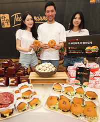 ソウル市麻浦区のロッテリア弘大店で23日午後、プルコギバーガー発売30周年を記念して登場した新商品「ダブル韓牛(韓国伝統の肉牛)プルコギバーガー」と「韓牛トリプルマッシュルームバーガー」をコンパニオ..