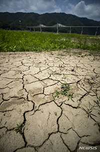 韓国各地で極度の日照りが続いている20日午後、江原道麟蹄郡の昭陽湖では、露出した湖底が干上がってひび割れていた。
