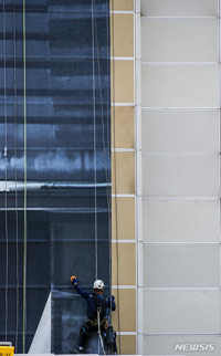 ソウル市鍾路区の光化門KT社屋工事現場で21日、関係者がビルの外壁のラッピング作業を手掛けていた。光化門KT社屋のリモデリング工事は、2023年4月の再オープンを予定している光化門広場の改善事業に合..