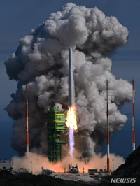 純粋に韓国の技術で設計・製造された韓国型発射体「ヌリ号」(KSLV2)が21日、全羅南道高興郡の羅老宇宙センター打ち上げ台から宇宙に向けて火炎を噴き出しつつ上昇していっている様子。実際の機能はない模擬..
