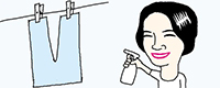 しわになったズボンは霧吹きで水を吹きかけるか、繊維消臭剤を吹きかけた後、洗濯ばさみですそをはさんで逆さまにつるしておくと、乾く時にしわが伸びる。