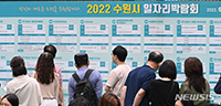 9日午後、京畿道水原市長安区の水原体育館で開催された2022年水原市就職博覧会で、就職情報生掲示板を眺める求職者たち。