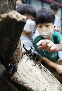 【NEWSIS】12日、ソウル市江南区のソウル貿易展示場(SETEC)で「第6回大韓民国ペット昆虫コンテスト」が行われた。写真はカブトムシなどに触れる体験をする子どもたち。