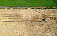 ロシアのウクライナ侵攻など国際情勢の不安定要因により穀物価格が暴騰する中、済州市翰林邑今岳里の国産小麦生産団地では、小麦の収穫真っ最中だった。国産小麦の食料自給率は0.8%にすぎないが、戦争の余波で穀..