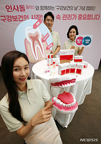 東国製薬が9日午前、ソウル市中区のザ・プラザホテルで「インサドル・プラスと共にある口腔保健の日キャンペーン」を行った。写真は、歯茎の薬を配合した「インサドル・プラス」を紹介するコンパニオンの様子。
