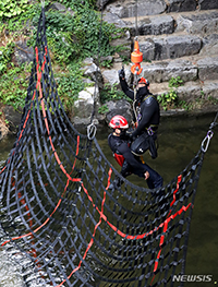 夏場の局地性集中豪雨により清渓川で市民が孤立したという緊急事態を想定し、ソウル市とソウル施設公団の職員、鍾路消防署および中部消防署の消防隊員などが9日午後、清渓川の五間水橋(ソウル市鍾路区)で市民救助..