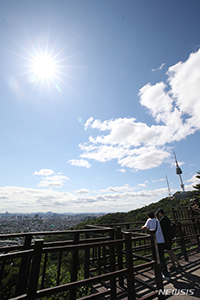 雨がやんですっきり晴れ渡った6日午後、ソウル市内の南山から眺めた空には雲が浮かんでいた。