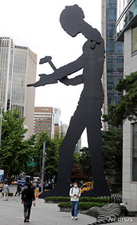 「Hammering Man」の銅像が20回目の誕生日(6月4日)を迎えた。写真は7日午後、ソウル市鍾路区の興国生命ビル近くに設置された像の前を行き交う市民の様子。