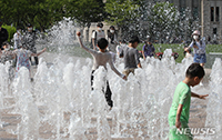 【NEWSIS】ソウルの日中の最高気温が27℃まで上がり、初夏の陽気となった22日午後、ソウル広場の噴水で水遊びをする子どもたち。