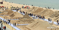 「2022年 海雲台砂祭り」が開幕した20日、釜山市海雲台区の海雲台海水浴場を訪れた市民や観光客が、さまざまな砂の造形作品を見て回っている様子。今月23日まで開催される今回の砂祭りでは、世界各国のラン..