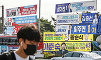 第8回全国同時地方選挙の選挙運動がスタートした19日午前、京畿道果川市のソンバウィ駅近くに候補者たちの横断幕が設置されていた。