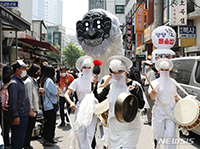 ソウル市鍾路区の光化門駅近くの路地商圏で20日、文化財庁と韓国文化財財団の関係者が「2022 春の宮中文化祝典」の一環として、魔除けの「辟邪」儀式と日常回復の望みを伝える「駆儺行-黒虎のお出ましです!..