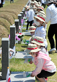 5・18民主化運動(光州事件)42周年を二日後に控えた16日午前、光州市北区雲亭洞の国立5・18民主墓地では、北区陽山洞にあるイニャン幼稚園の園児たちが参拝していた。