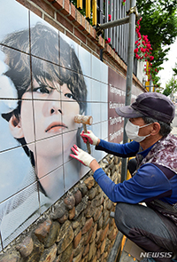 13日午前、防弾少年団(BTS)のメンバー、V(本名キム・テヒョン)の母校である大邱市西区飛山洞のデソン小学校の外壁で、「V壁画通り」延長のためのタイル張り作業が実施された。西区は中国のファンの集い..
