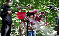 11日午前、ソウル市瑞草区を流れる陽才川に整備された自転車レンタルサービスセンターで、自転車の無料レンタルサービスを受ける子どもの様子。