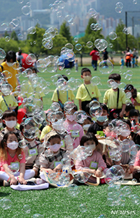 「騒々しいドリームマーケット! 幸せ分かち合い広場」が開催された11日午前、釜山市北区の華明生態公園サッカーグラウンドで、地元のオリニチプ(民間保育施設)の園児らがバブルショーを鑑賞しているところ。北..
