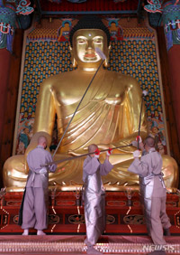 ソウル市中区の曹渓寺大雄殿で4日、僧侶らが掃除灌浴儀式を行っている様子。