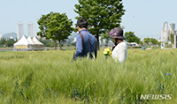 蔚山市中区を流れる太和江沿いでは28日、市民たちが緑色に染まった麦畑の道で楽しいひとときを過ごしていた。