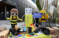 Kpop4Planetの会員たちが21日午前、ソウル市竜山区にあるHYBE INSIGHT前で、K-POPアルバムがプラスチックごみとして捨てられないよう対策を講じることを求めるパフォーマンスを繰り..