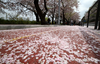 12日午前、ソウル市永登浦区輪中路のサクラ並木道(汝矣西路)は、地面に落ちたサクラの花びらでいっぱいになっていた。