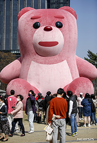 うららかな春の天気となった4日午後、ソウル市松坡区に位置するロッテワールドタワーの芝生広場では、訪れた市民が「ベリークマ」と共に記念写真を撮っていた。